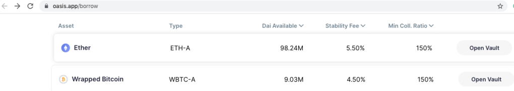 The following snapshots are taken from Oasis home page. The first snapshot shows that the stability fees can vary vault by vault. The second snapshot shows what a Maker Vault looks like.