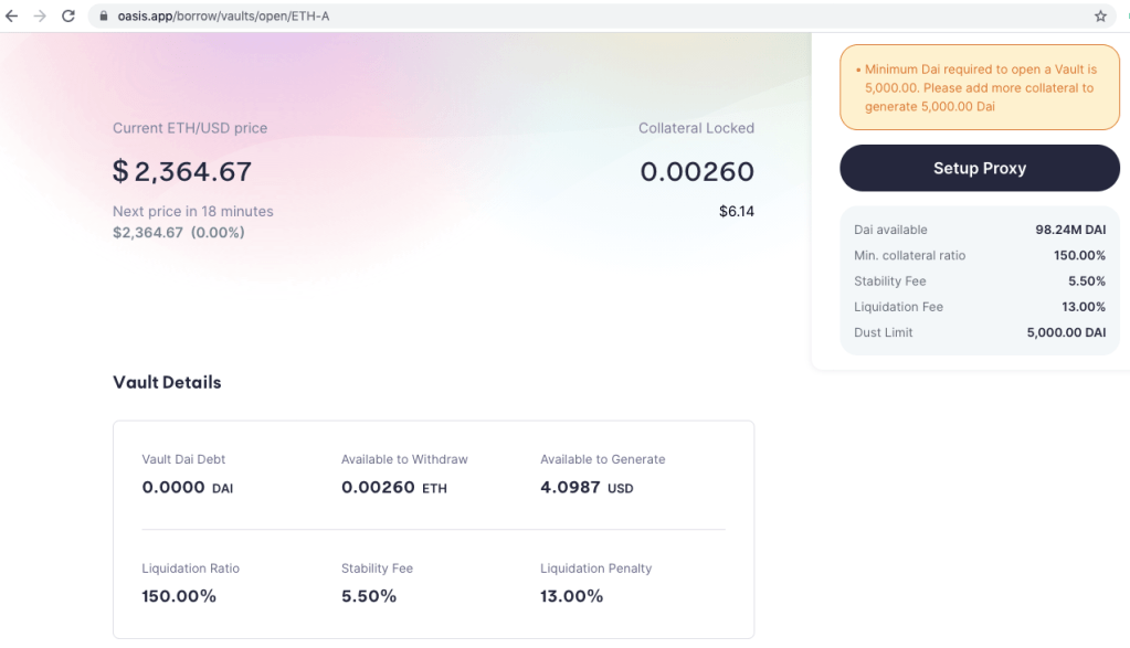Dust Limit The minimum amount you need to open a Vault on Oasis Borrow (MakerDao’s borrowing and lending platform). The current dust limit is 5,000 Dai or $5,000.
