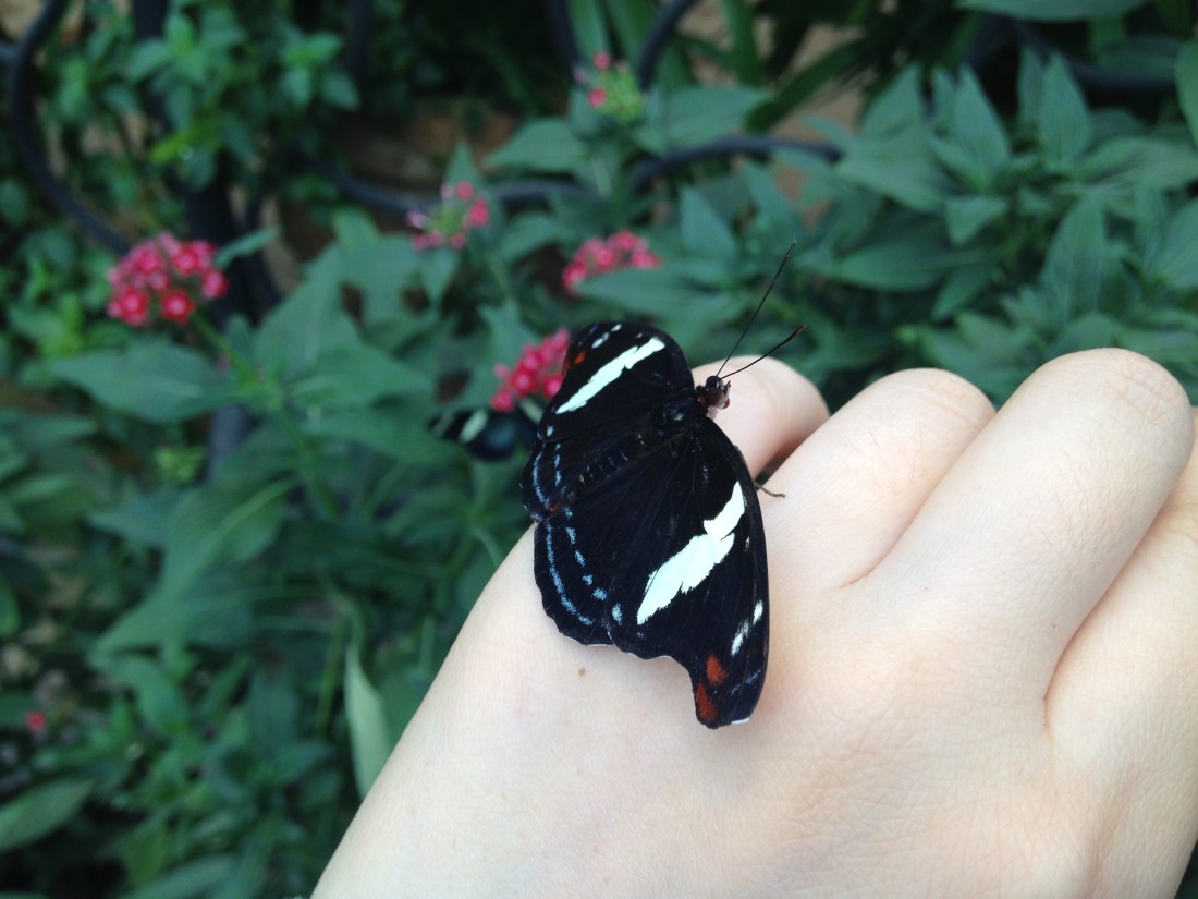 I remember roughly one month ago I was in this butterfly garden, Costa Rica. It was heavenly beautiful, having hundreds or maybe thousands of butterflies flying around you. I was excited, hoping one of the butterflies will stop on my arm, preferably one of those dreamy purple ones. I waited and waited, then all of a sudden, a little black butterfly with two yellow strips stopped on my hand. I smiled. It is the most beautiful butterfly I have ever seen.