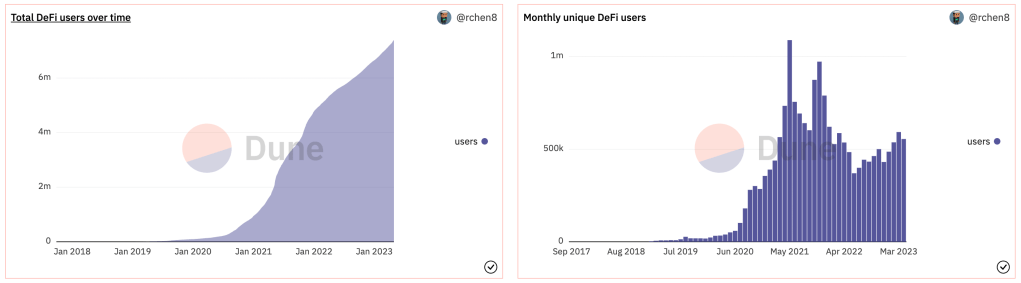 In terms of users, the number of DeFi users broke one million mark in January 2021. Today the total number of users that interacted with DeFi protocols stands above 7.3 million. It took 749 days to reach one million users, and it took about the same time to 7x the number. Slowly, slowly, then suddenly.